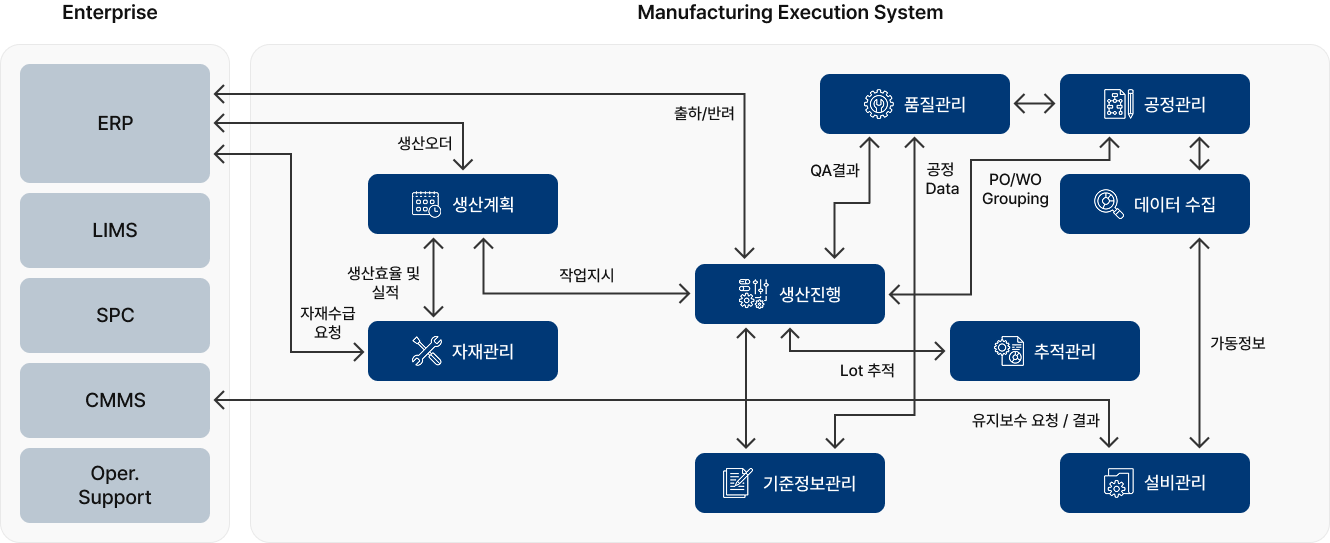 MESA, ISA-95의 표준화된 생산관리 프로세스와 공정/품질/자재/KPI 등 제조 주요영역의 관리기능 제공
